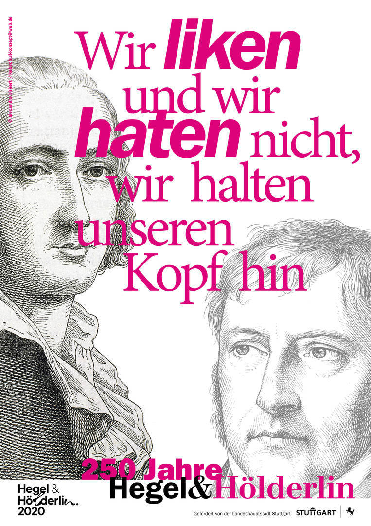 Mit grafisch und textlich aufeinander bezogenen Plakaten und Postkarten wollten wir, Nicole Kebschull und Alexandra Birkert, im öffentlichen Raum der Stadt auf das für Stuttgart so besondere Doppeljubiläum von Hegel und Hölderlin im Jahr 2020 aufmerksam machen.